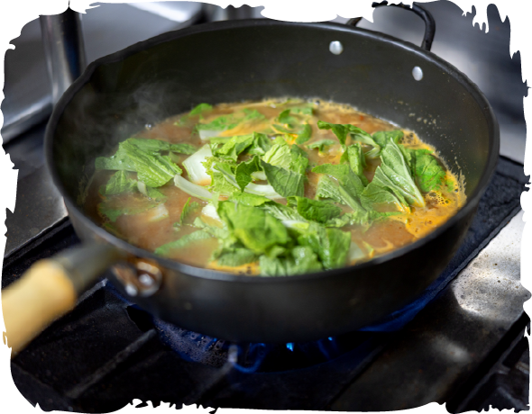 국수가 익을 무렵 방아, 깻잎, 다진 파, 고추를 넣고 한소끔 더 끓인다.