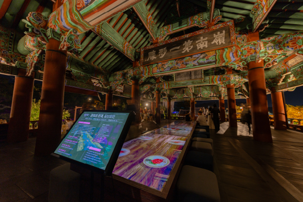 또 촉석루 누각 위에서는 진주비빔밥과 진주 차 문화가 담긴 미디어 테이블이 펼쳐진다. 이 미디어 테이블을 감싸는 노을 문양은 소목장 김동귀 작가의 작품으로, 디지털 기술과 진주시의 전통문화가 조화롭게 엮인 결과물이다.