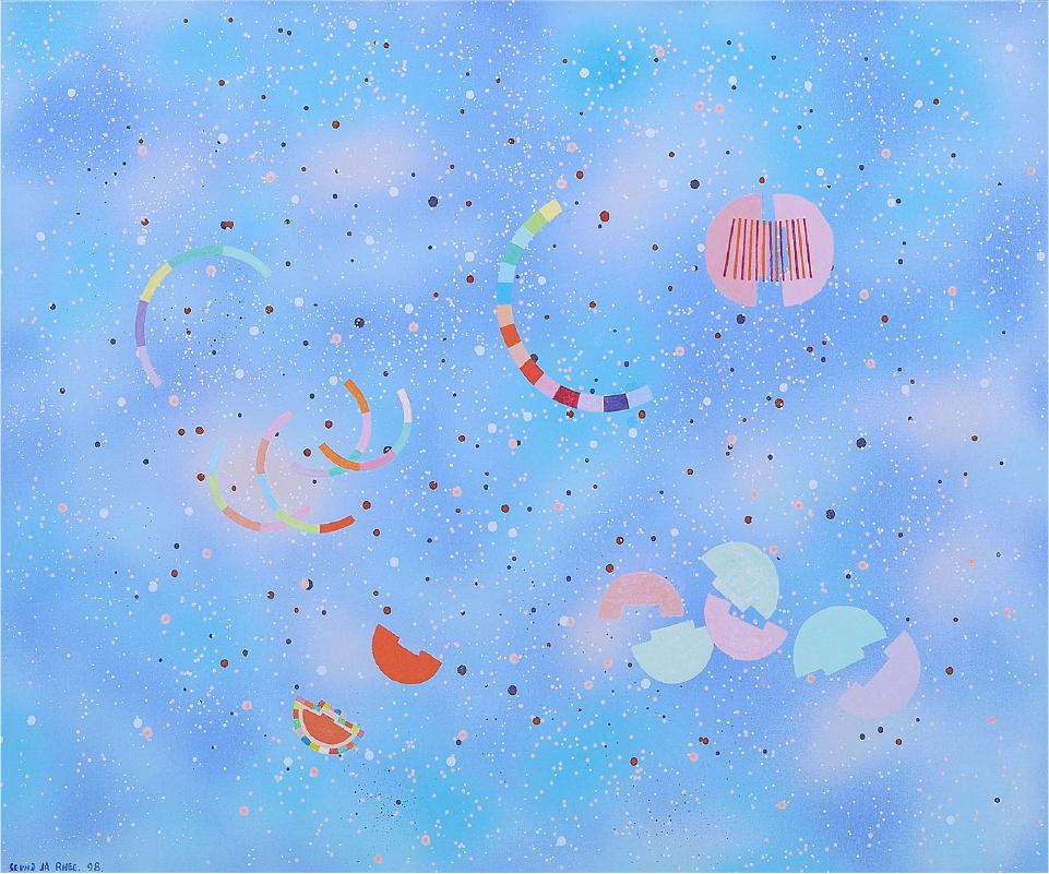 화면에 적용된 파스텔 색조의 부드러운 색조는 겹침과 투명성을 통해 저 너머의 차원을 암시하며, 곳곳의 드리핑 효과는 별자리의 진동처럼 남아있다. 이러한 조형적 선택은 이성자가 구축한 추상적 우주 공간이 단순한 비가시적 영역이 아니라, 감각적 경험과 정신적 탐구가 교차하는 장소임을 보여준다.