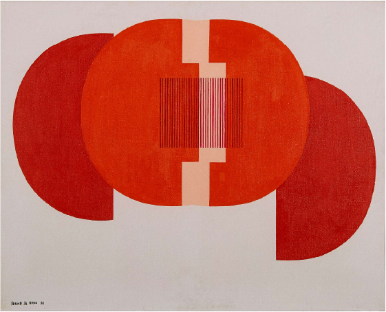 〈진주 1960년〉은 작가의 내면에 남아 있던 진주의 정서를 추상적 구성으로 응축한 대표작이다. 화면의 색면은 남강의 물결처럼 부드럽게 흘러가고, 서로 맞물린 형태들은 산세의 율동과 기억의 파동을 담아낸다. 붉은색과 청색의 대비는 감정의 진폭을 시각화하며, 이성자 특유의 ‘추상적 감정의 지도’를 이루어낸다. 이 작품에서 풍경은 재현의 대상이 아닌 기억이 남긴 정서적 결이 색과 선의 리듬으로 전환된 정신적 풍경이다.