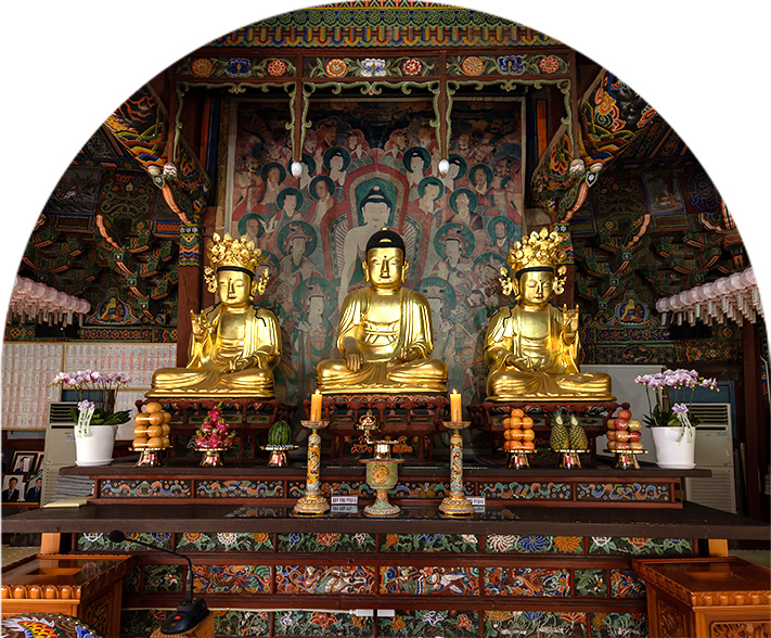 석가모니불좌상을 중심으로 좌측에 지혜를 의미하는 문수보살 좌상,
