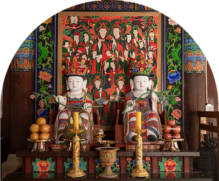 대웅전을 지키는 목조석가여래삼존좌상과 대범천왕, 제석천왕만이 보물이 아니다. 대웅전에서 불과 몇 걸음 떨어진 곳에 있는 업경전에 봉안된 목조지장보살삼존상과 시왕상 그리고 금강역사상도 보물로 지정되었다. 업경전에 모셔져 있는 지장보살을 훑어보았다. 소박한 외관과는 달리 화려한 문양과 사실적으로 조각된 명부시왕, 금강역사상 등의 목조각상이 가득하다.