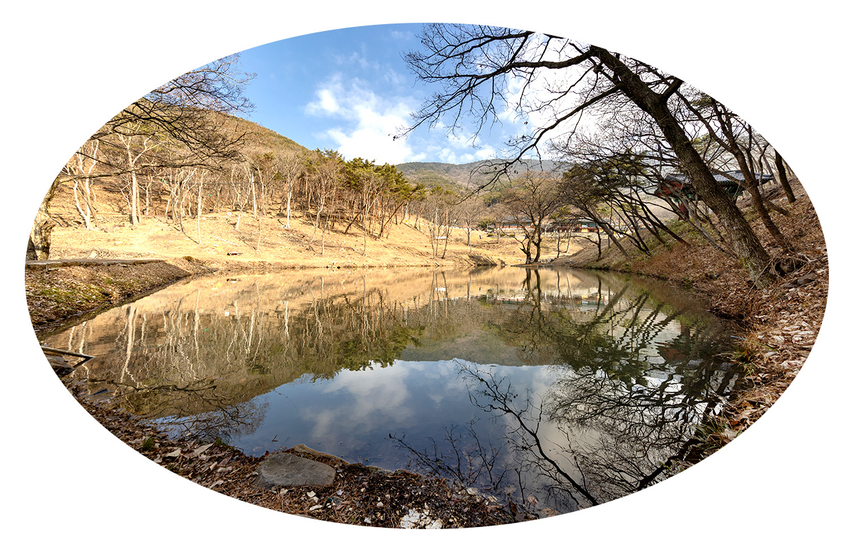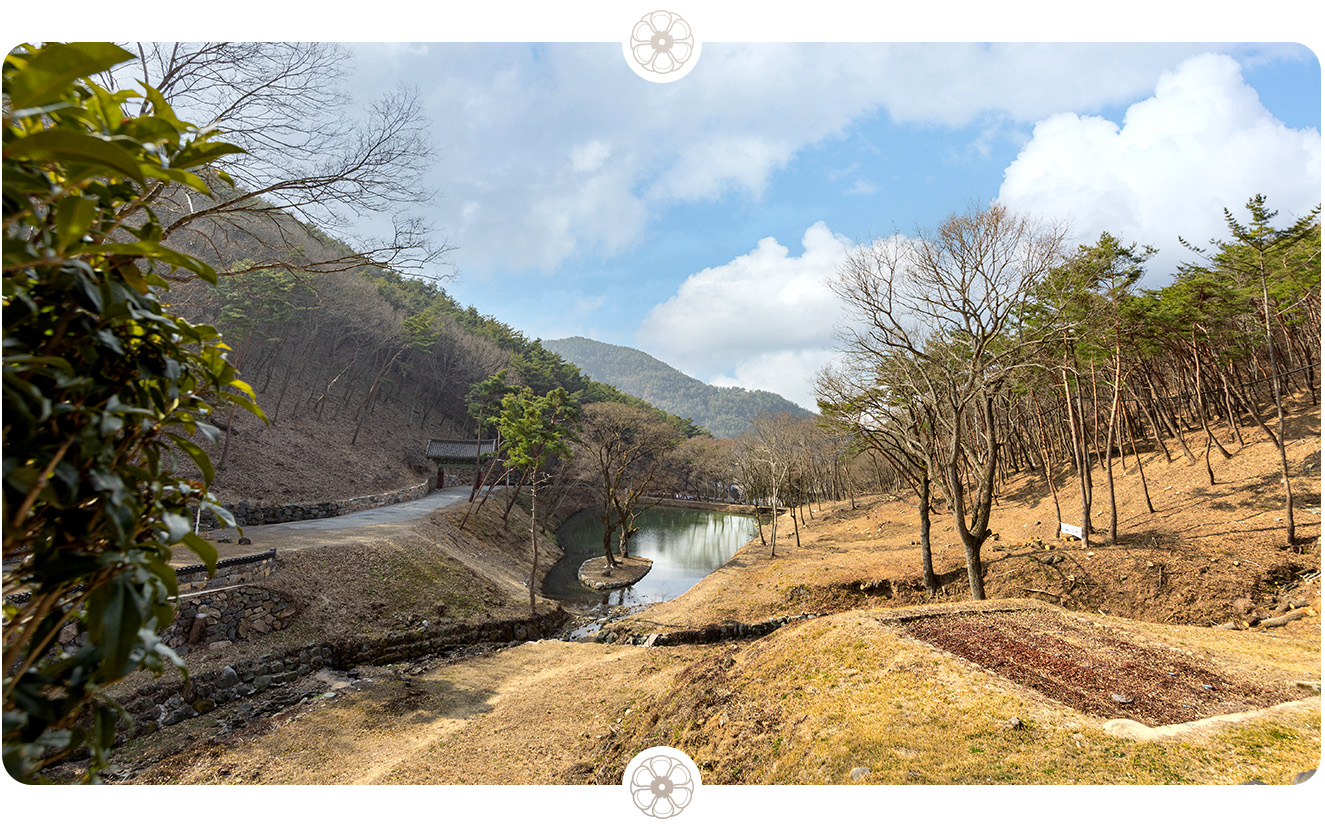 일주문을 지나 학이 찾아온 다리인 방학교(訪鶴橋)를 건너면 고목이 굳건히 서 있다. 봄을 기다리는 나무 아래에서 학영지를 굽어보니 속세에서 벗어나 별세계에 와 있는 듯하다. 못을 둘러싼 산줄기와 윤슬로 반짝거리는 푸른 물결. 퇴계 이황은 청곡사를 지날 때 세상을 떠난 셋째 형을 그리워하며 시를 남겼다.