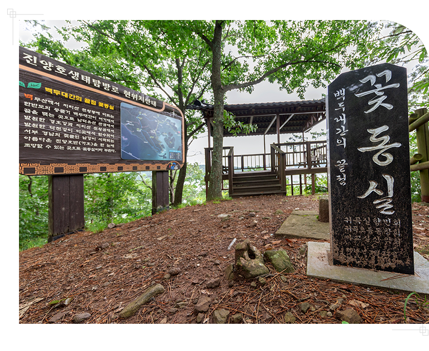 백두대간 완주를 위해서는 꼭 걸어야 하는 마지막 마을이면서, 동시에 새롭게 백두대간 도보 여행을 시작하는 사람들이 방점을 찍어야 하는 마을이다. 진양호 호반 중간의 봉긋한 언덕 위에 있는 꽃동실 전망대가 바로 그 지점이다.