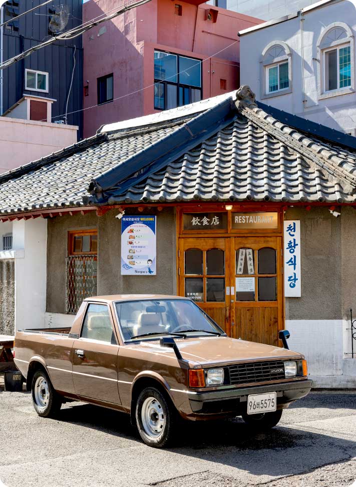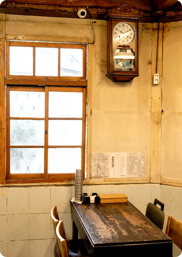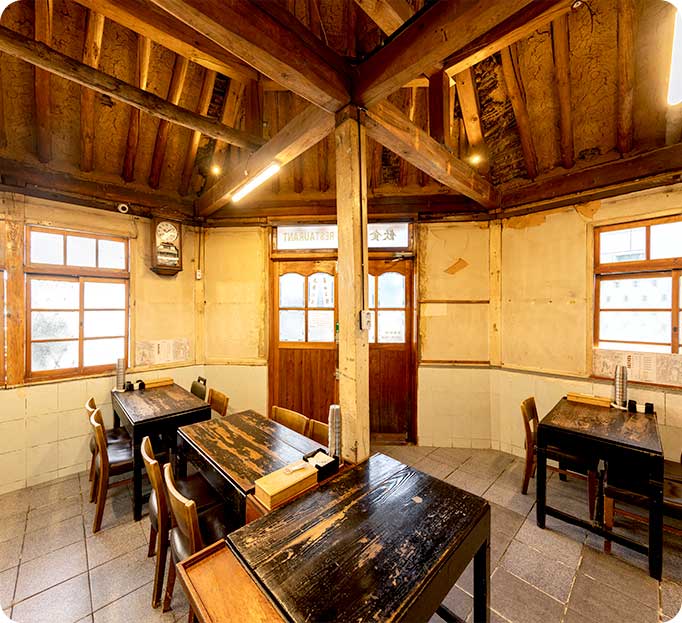 흔히들 오래된 식당을 ‘백년식당’이라 부르지만 실제로 100년 이상을 운영한 가게는 드물다. 그 세월을 고스란히 간직한 천황식당은 외관부터 세월의 깊이가 묻어난다. 가게 입구에서 낯선 객을 반겨 주는 클래식한 자동차와 오래된 기와지붕, 그리고 손으로 쓴 나무 간판에는 흰색 바탕에 파란색 ‘천황식당’ 글자가 단정하게 적혀 있어 사람들의 시선과 마음을 붙든다. 나도 모르게 어느새 문을 열고 들어가게 된다. 문에 힘을 주자, ‘끼이익’하고 문 열리는 소리가 들리는데 그것마저 정겹다.