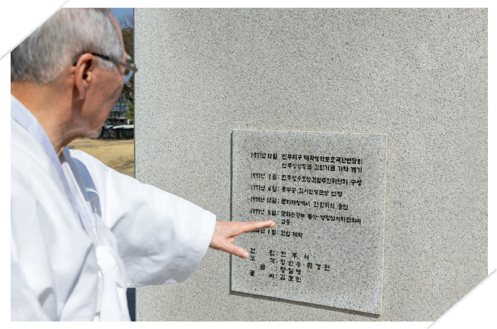 “1997년 김시민 장군 동상을 건립하기로 하고 이듬해 건립 위치가 논의되었는데, 진주시내 중앙광장에 세우자, 임진대첩 계사순의단 앞 광장에 세우자, 창렬사 뒤쪽에 우뚝하게 세우자, 여러 이야기가 있었습니다. 그 당시 문화재청(현 국가유산청)에서 현재 이 자리에 세워야 한다고 해서 이루어진 것입니다.”