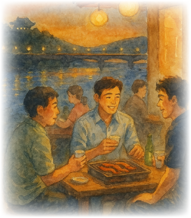 찾아오는 여행자들은 남강의 야경을 바라보며 먹는 장어구이는 필수 코스였다.